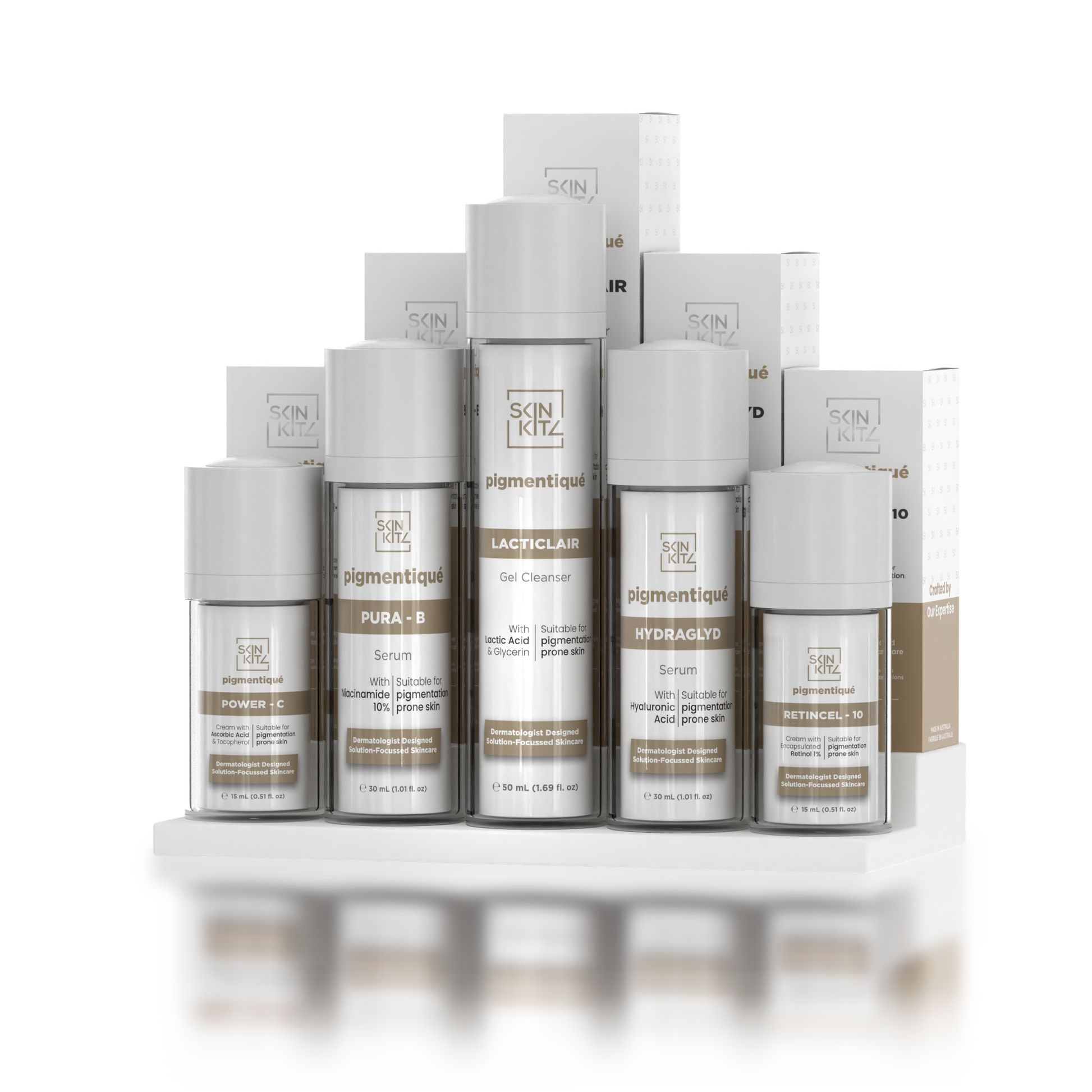 The SkinKitz Pigmentiqué Kit includes 5 products, including Pigmentiqué Hydraglyd Serum, Pigmentiqué Pura-B Serum, Pigmentiqué Lacticlair Gel Cleanser, Pigmentiqué Retincel-10 Cream and Pigmentiqué Power-C Cream.